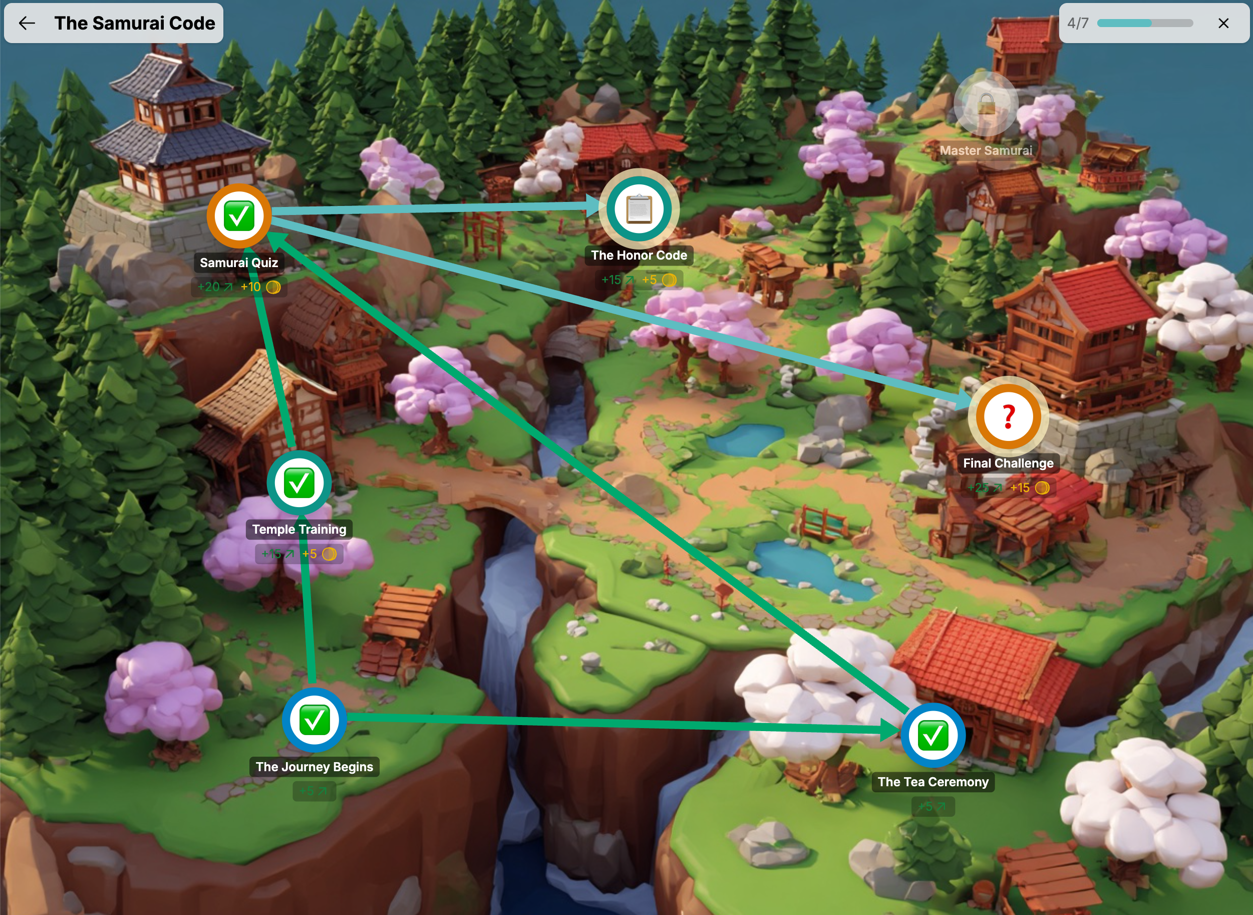 A célok közötti ösvények mutatják, melyeket kell befejezned, mielőtt a következők feloldódnak. Néha az ösvények elágaznak — ez azt jelenti, hogy egyszerre több opcióval dolgozhatl. Máskor az ösvények összetartanak — ez azt jelenti, hogy több célt kell befejezned, mielőtt a következő feloldódik.