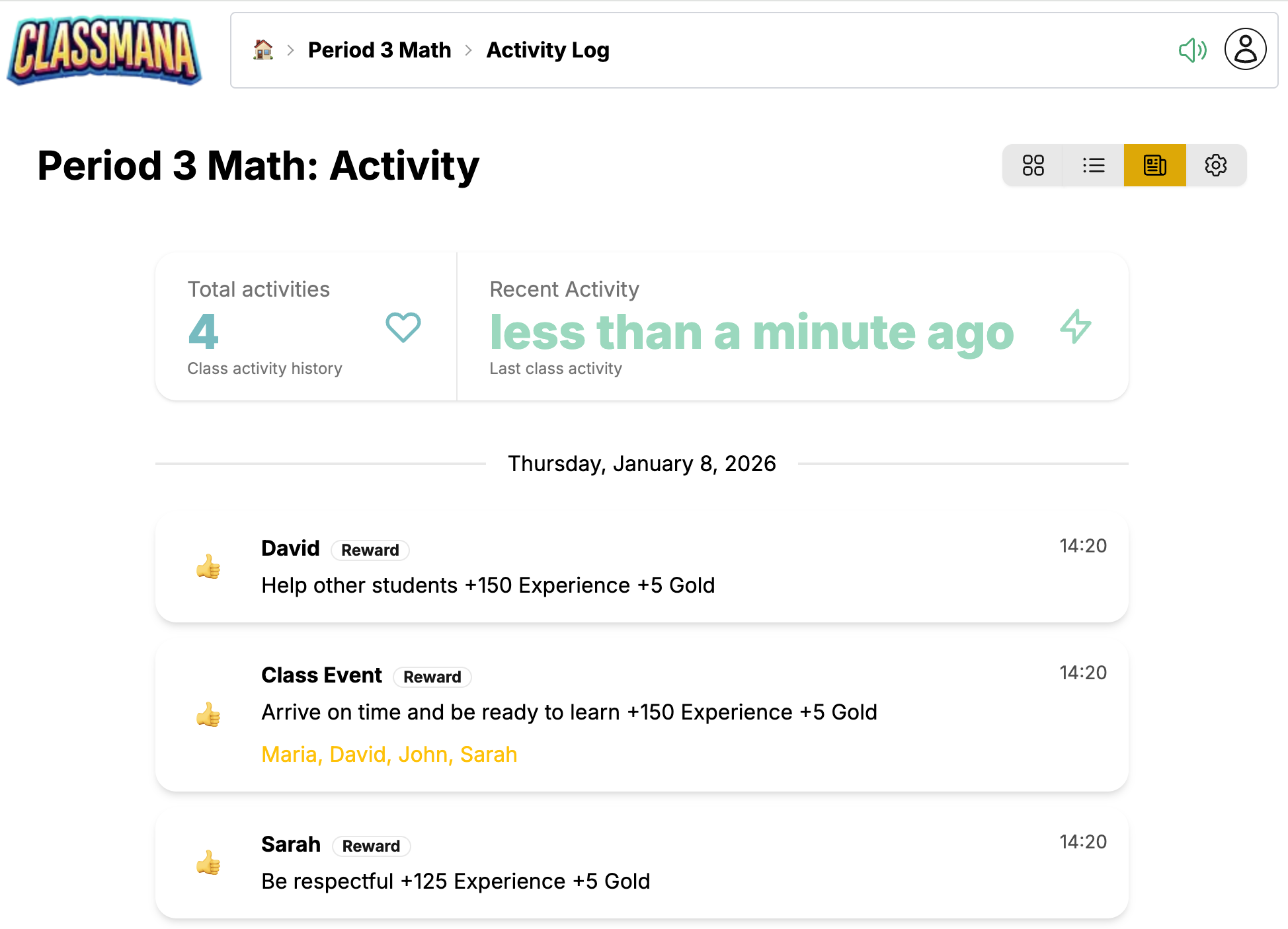 Az Osztály Irányítópult a központi központod egy osztály kezeléséhez. Innen megtekintheted a diákokat, jutalmakat adhatsz, erőket használhatsz, nyomon követheted a tevékenységeket és konfigurálhatod az osztály beállításait.