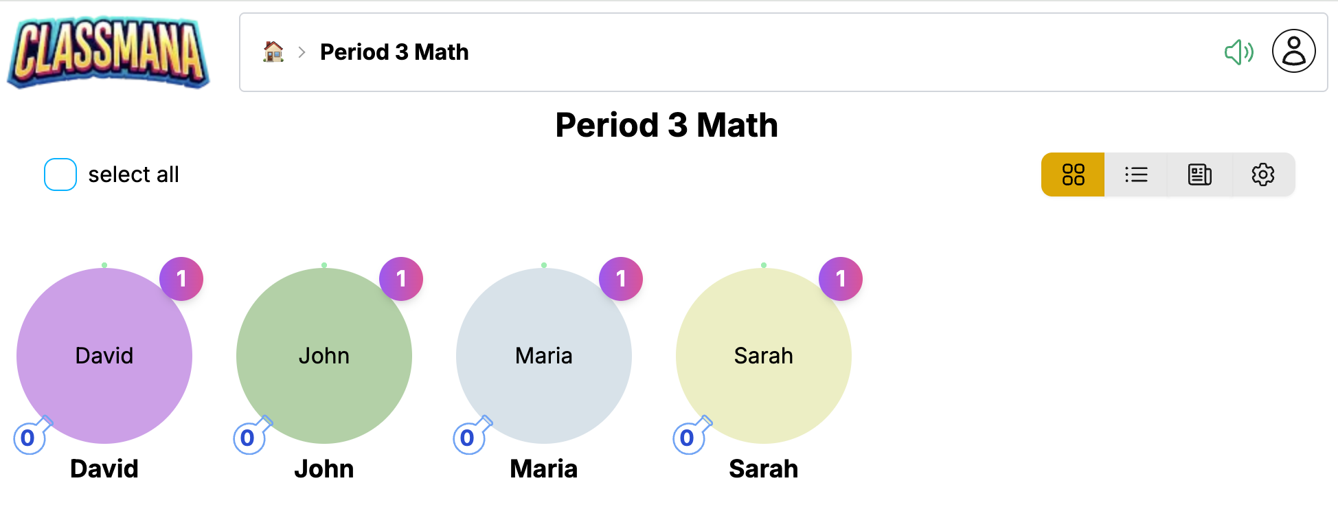 A Diák Rács az alapértelmezett nézet, amely minden diákot vizuális kártyaként mutat.