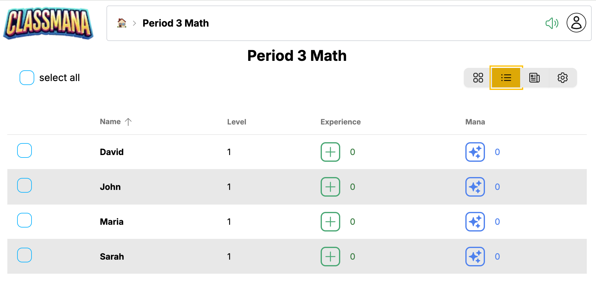 Használd a jelölőnégyzetet minden kártyán több diák kiválasztásához, majd végezz tömeges műveleteket: