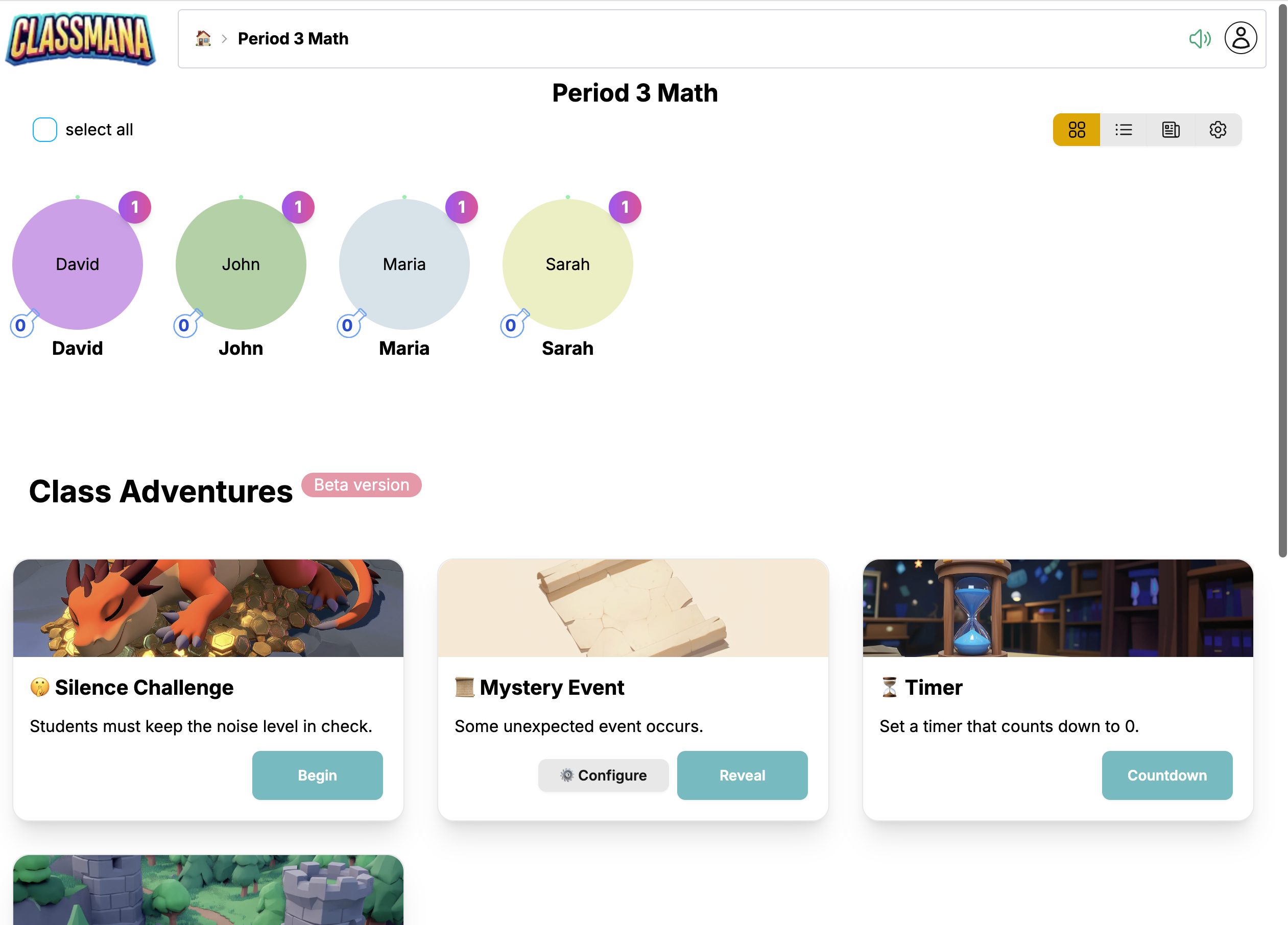 Az osztály vezérlőpultod most már mutatja a tanulóidat (ha hozzáadtál) és készen állsz a jutalmak osztogatásának megkezdésére.