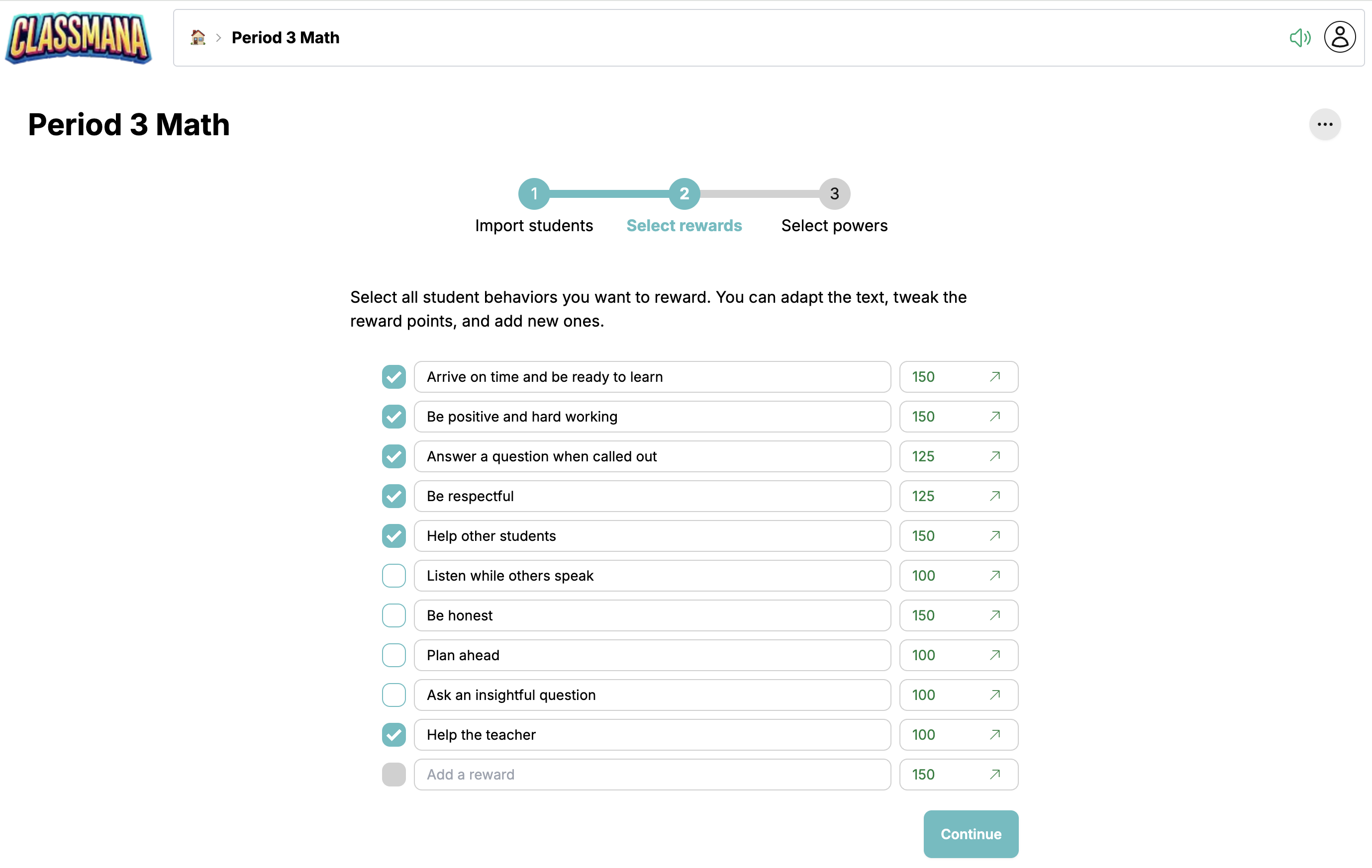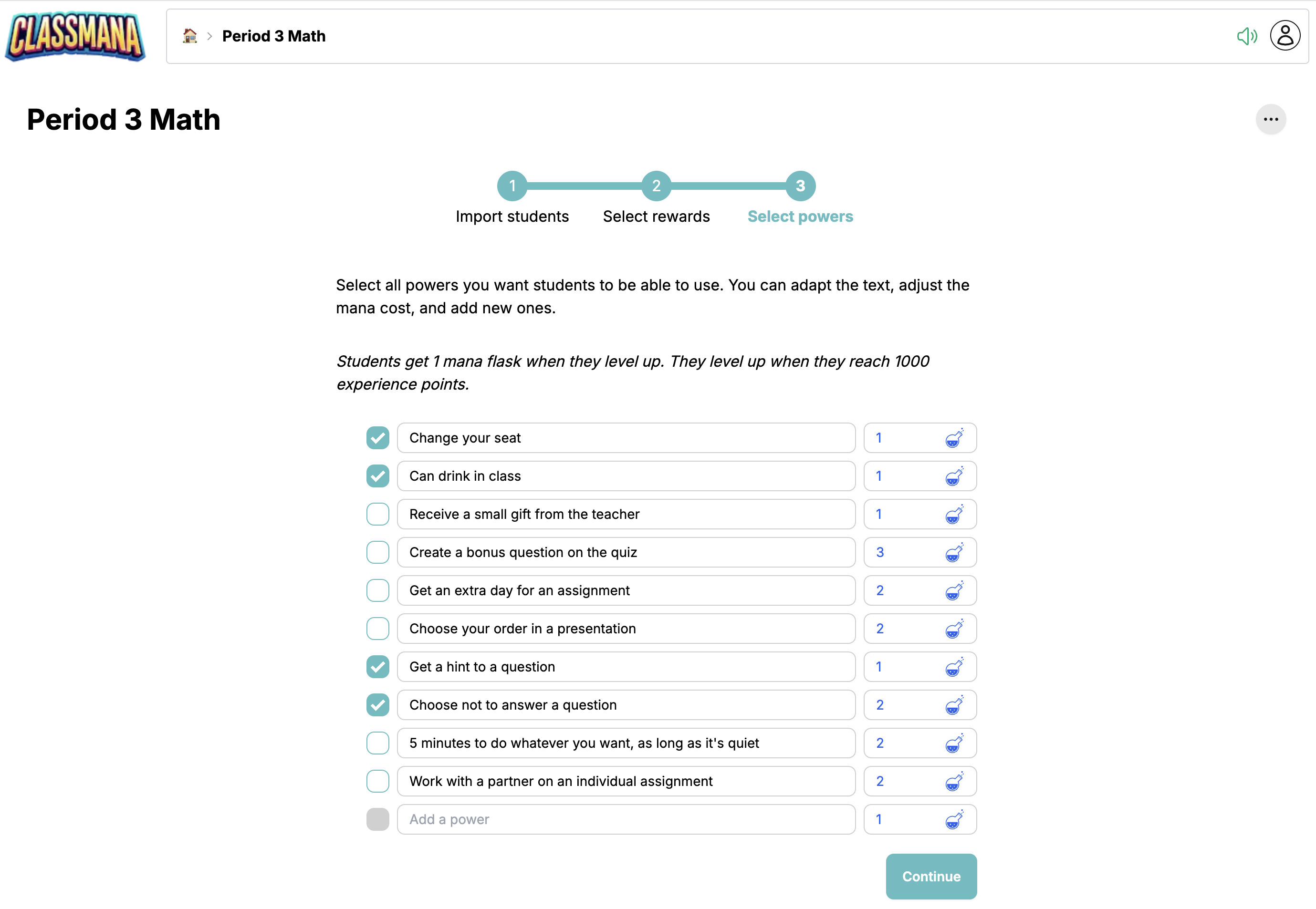 Az osztály létrehozása után egy 3 lépéses beállítási varázslón mész keresztül a tanulók, jutalmak és képességek konfigurálásához.