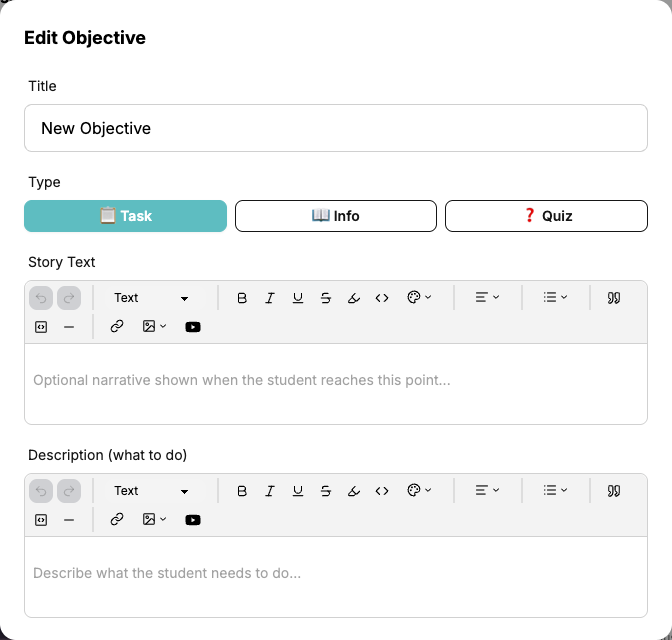 A küldetés célok rich text szerkesztőt használnak a Történet Szöveg és Leírás mezőkhöz. Ez lehetővé teszi, hogy túllépj az egyszerű szövegen — adj hozzá formázást, képeket, linkeket, és akár YouTube videókat is, hogy vonzóbbá tedd a küldetéseidet.