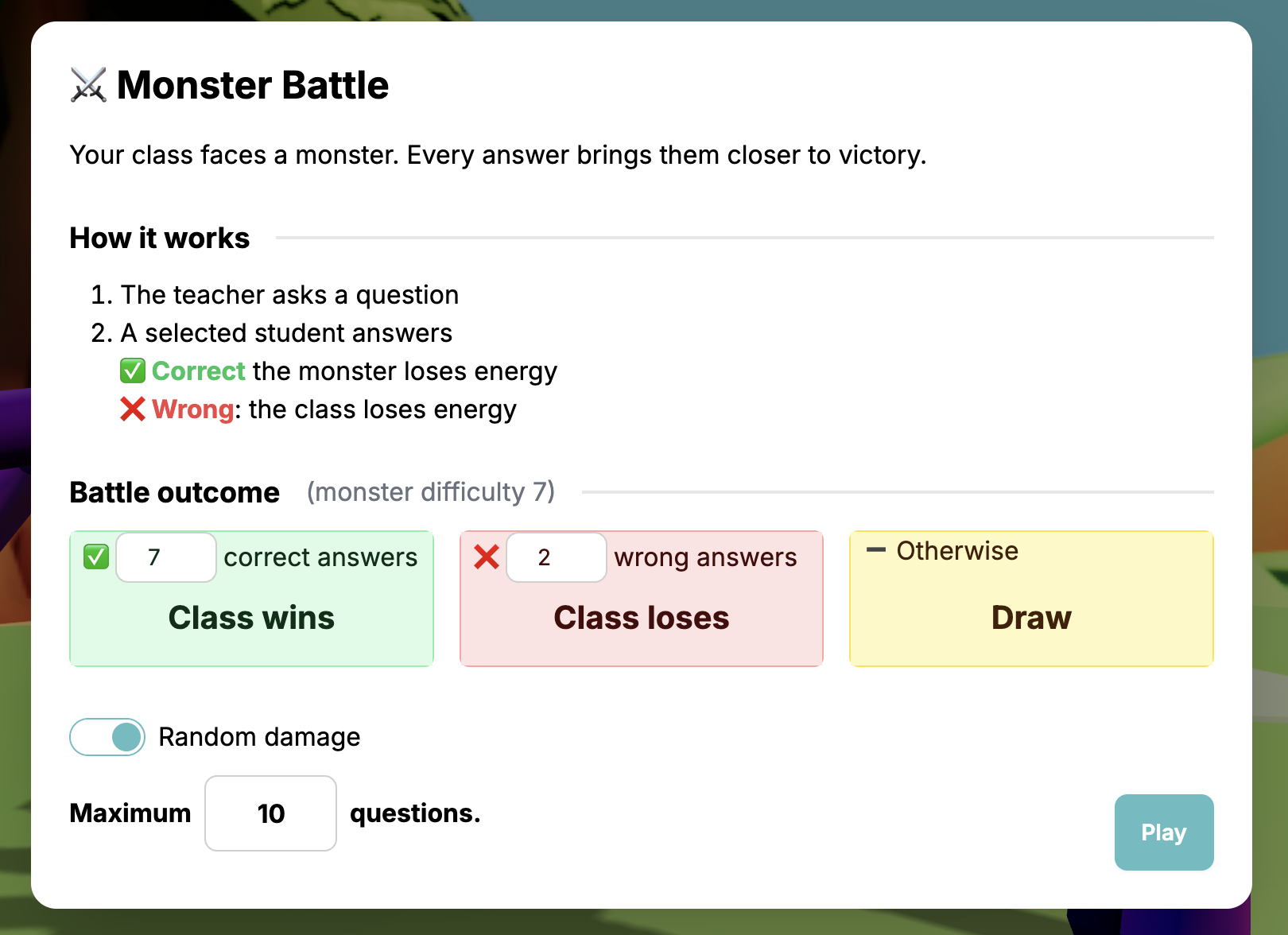 - A csata folytatódik amíg a szörny le nem győzetik, az osztály el nem veszti az összes energiáját, vagy el nem érik a maximális kérdésszámot