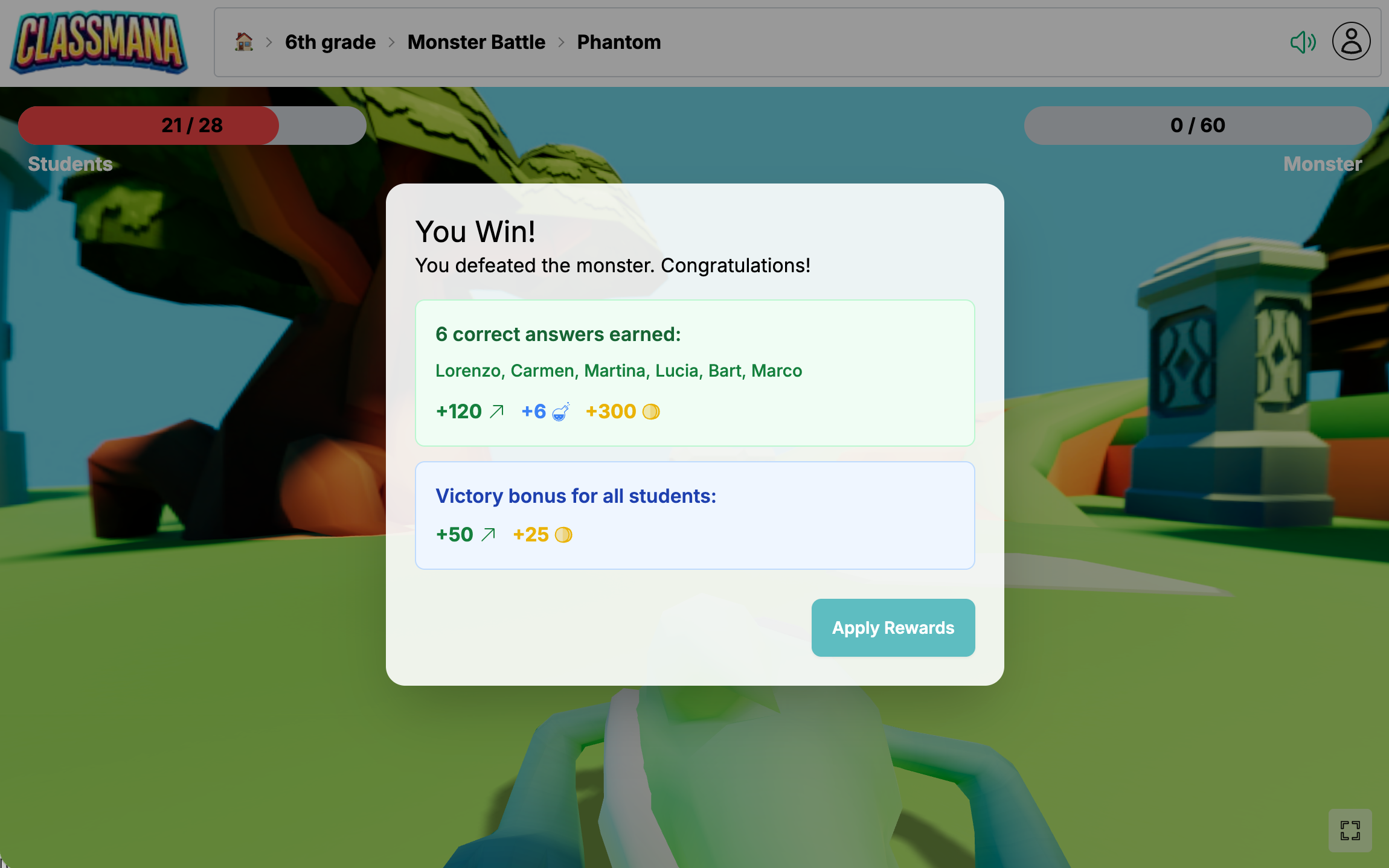 Kattintson a Jutalmak alkalmazása gombra az összes jutalom hozzáadásához a diák profilokhoz. Tevékenység napló bejegyzések automatikusan létrejönnek olyan megjegyzésekkel, mint "Szörny Csata Helyes Válasz" vagy "Szörny Csata Győzelmi Bónusz".