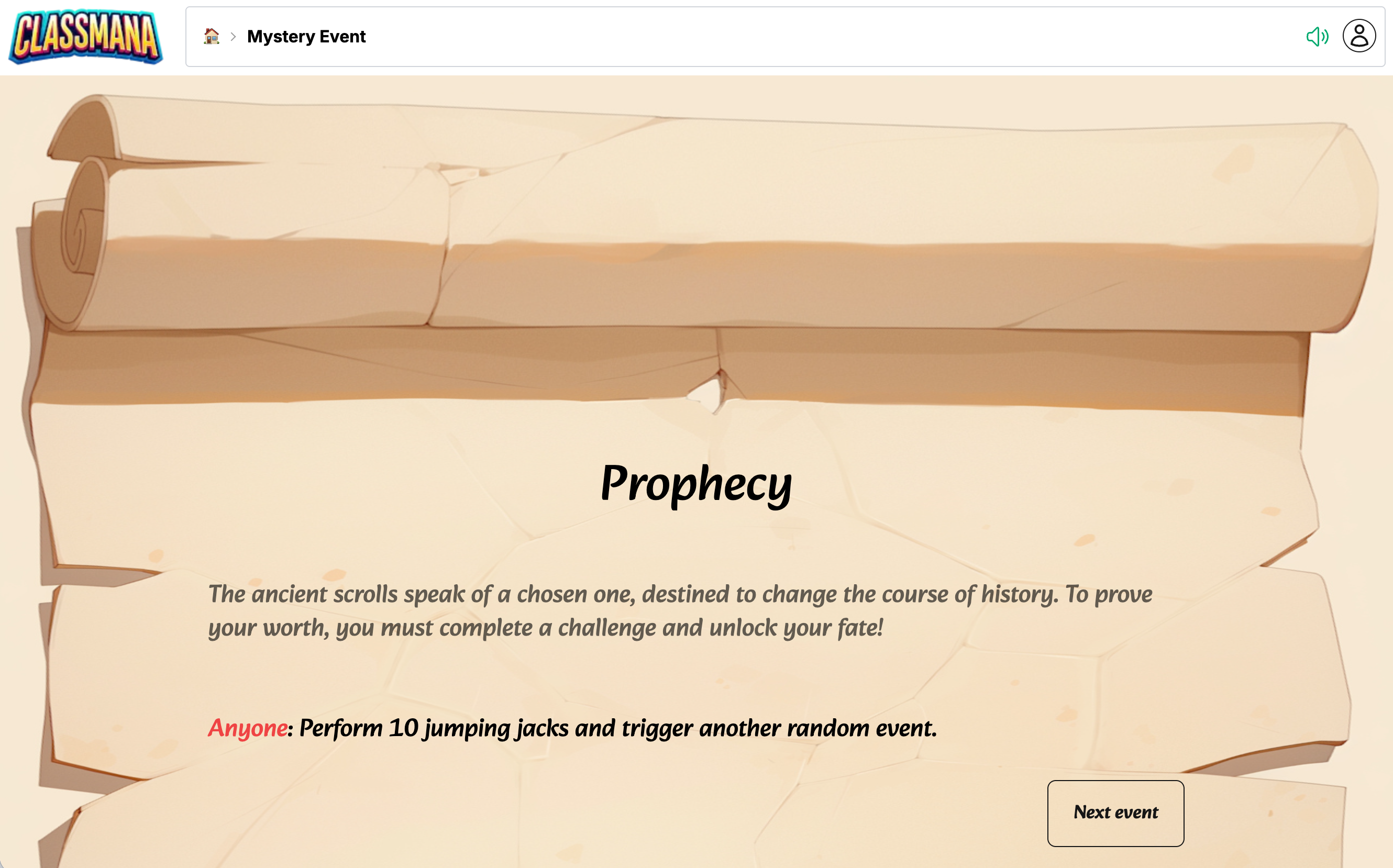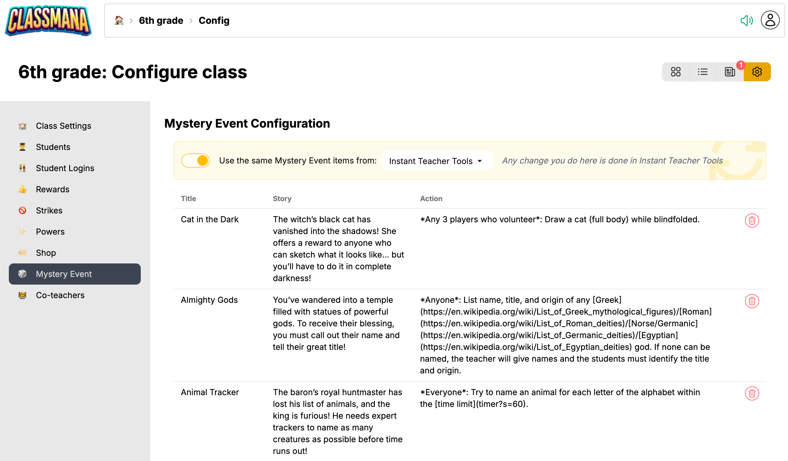 Amikor Rejtélyes Eseményeket használsz egy osztályon belül, minden osztálynak lehet saját eseménykészlete — vagy szinkronizálhatod őket egy másik osztályból. Érd el az osztály konfigurációjából: 🏠 Irányítópult → Osztály → ⚙️ Konfiguráció → 🎲 Rejtélyes Esemény
