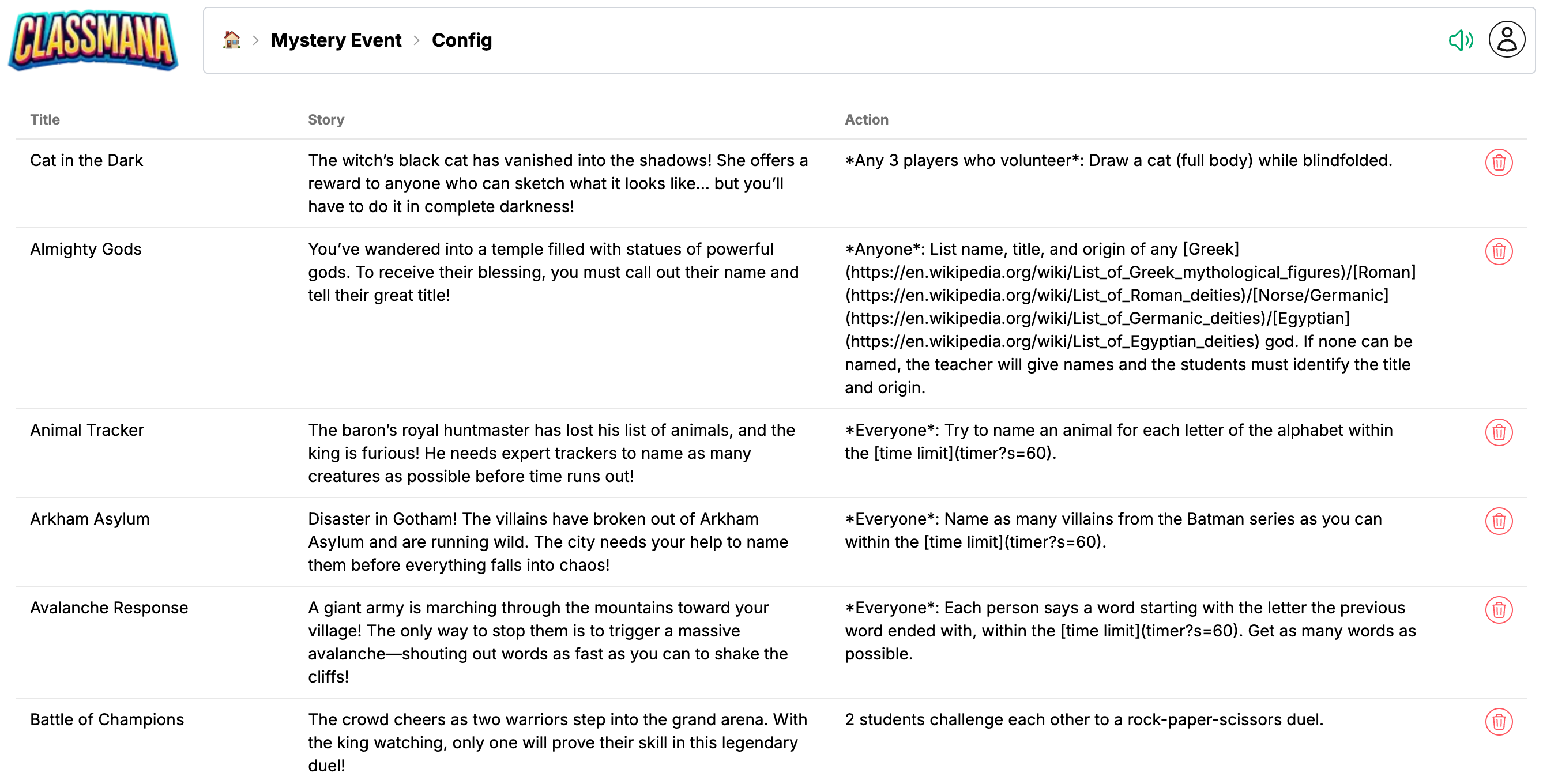 Egy ClassMana esemény eltávolításához kattints a törlés gombra a sorában.